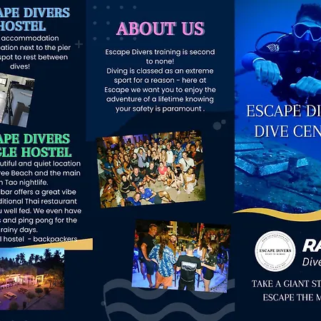 Escape Divers Hostelは,33の客室があります. 読書灯 とベッドサイドリ-ディングライトを備えたベッドを提供します. 個別のトイレ とシャワ-があります.